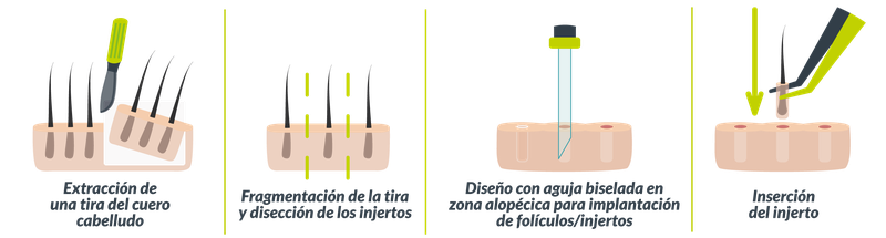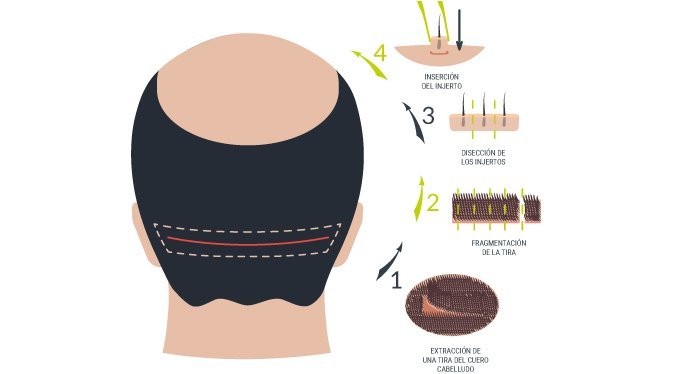 Una vez extraída la tira se procede a suturar la zona donante, uniendo los bordes del cuero cabelludo, donde quedarán puntos de sutura que deben ser retirados a los 10 días.